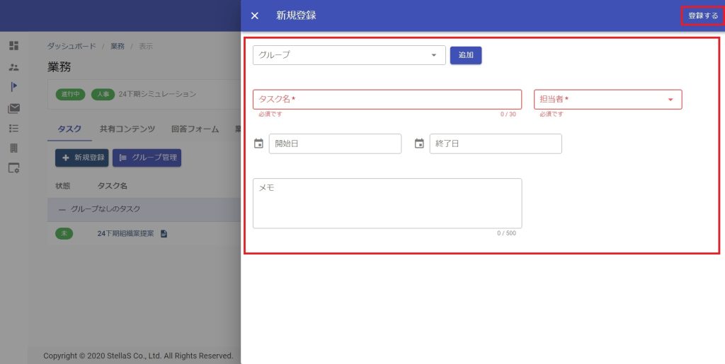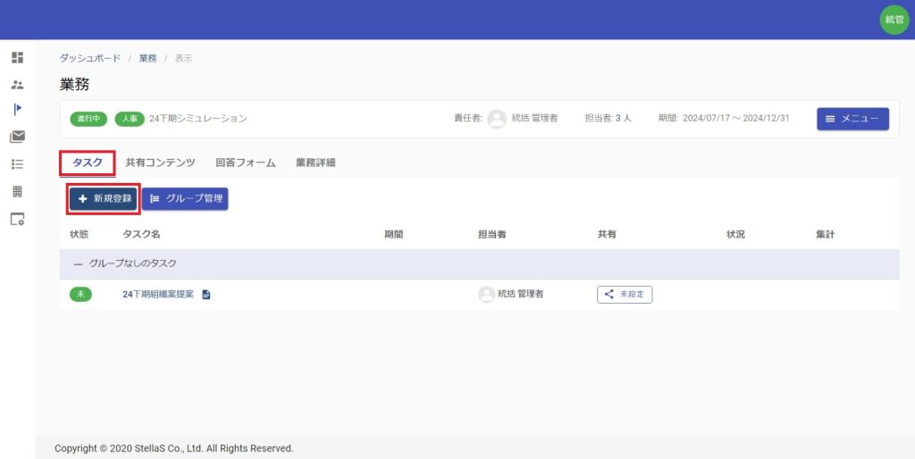 (2)[タスク]タブをクリックし、[+新規登録]をクリックします。