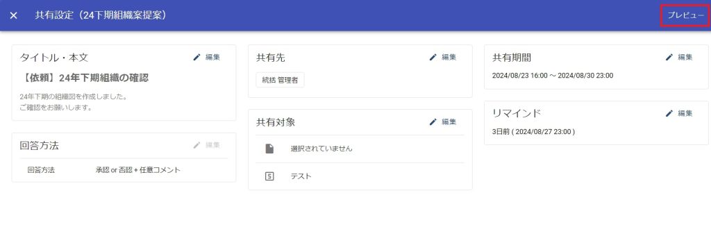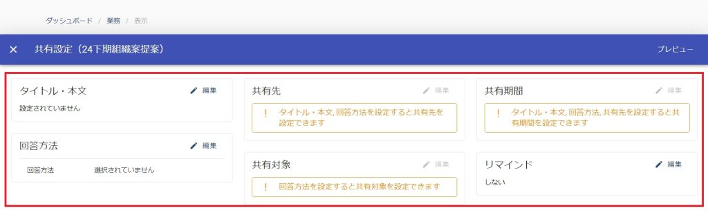 ※「タイトル・本文」「回答方法」を設定すると「共有先」「共有対象」「共有期間」を設定することができます。