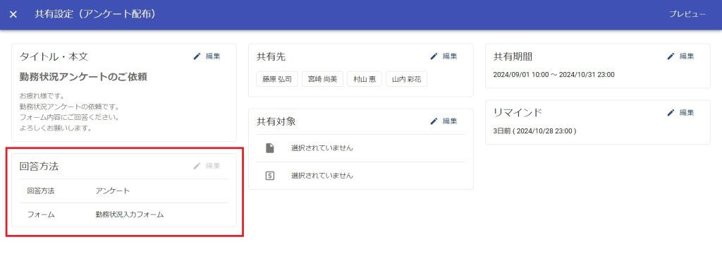 (4)作成したアンケートを社員へ共有する場合は、タスクを作成し「共有」の[未設定]から設定を行ってください。回答方法より作成したアンケートを選択してください。