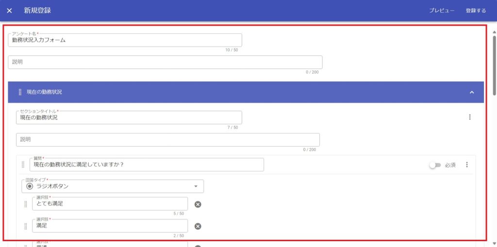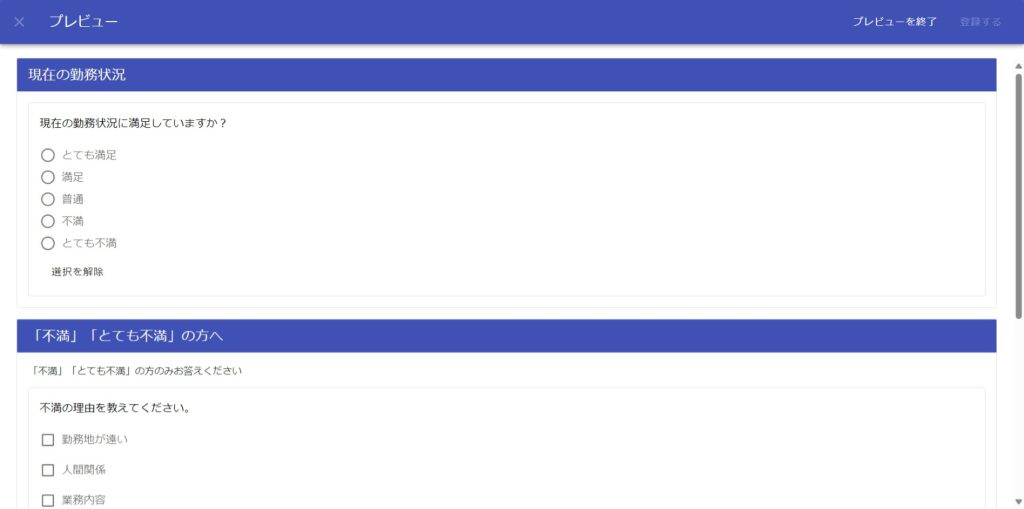 [プレビュー]をクリックすると実際の回答フォームを確認することができます。
