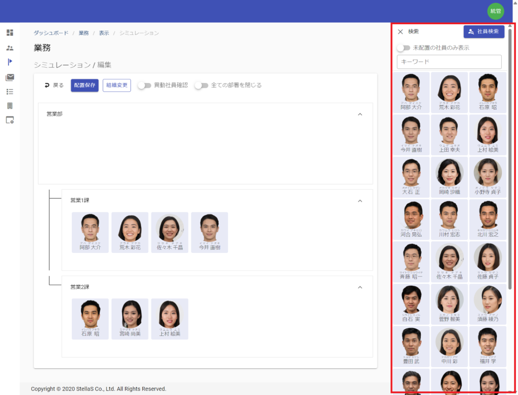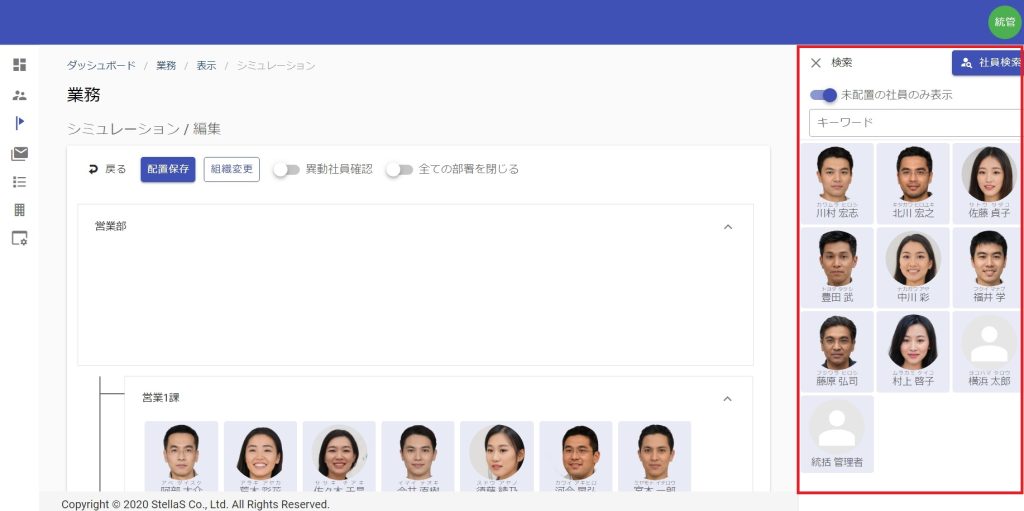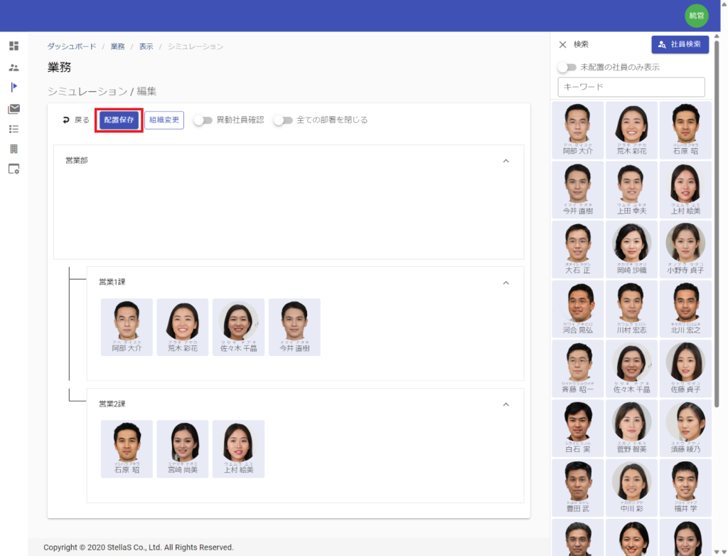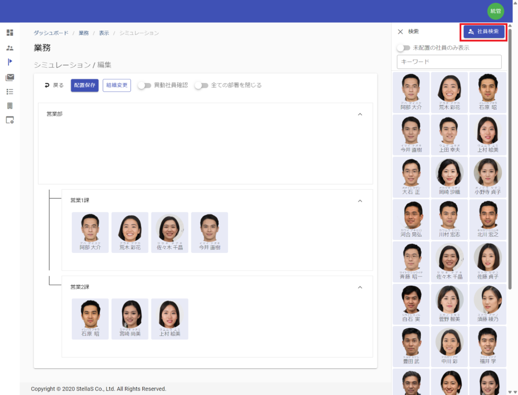 (6)あらかじめ登録した[組織]が表示され、社員を配置していきます。配置する場合は、