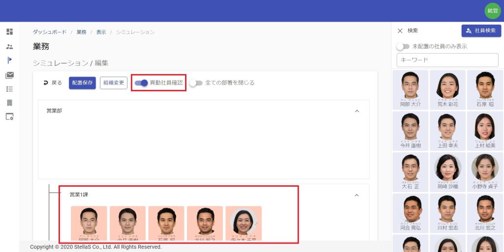 [異動社員確認]をオンにすると異動した社員を確認することができます。