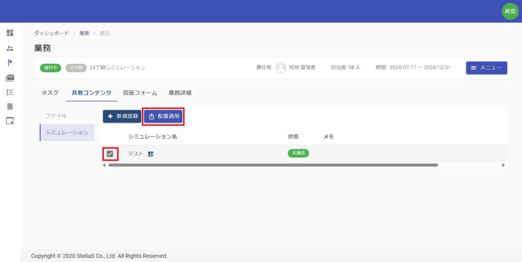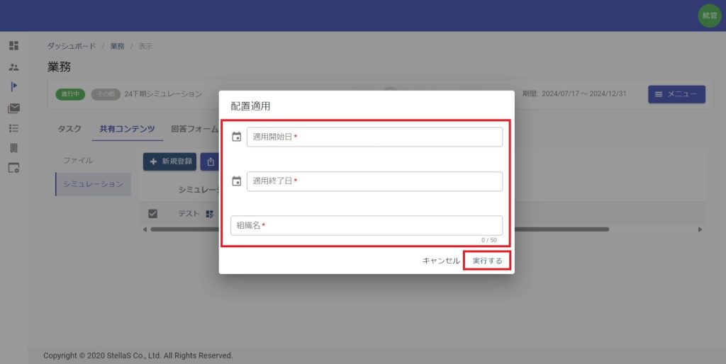 3.複数のシミュレーションのうち、一つのみを「配置適用」(期間と組織名を登録する)することが可能です。