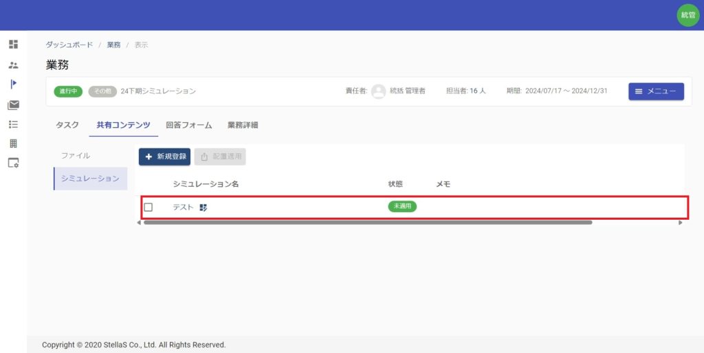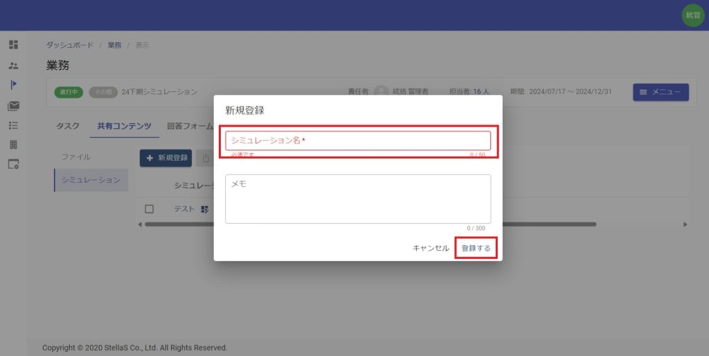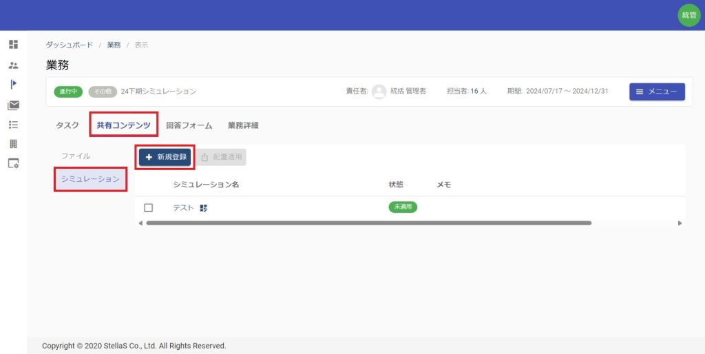 (3)[共有コンテンツ]→[シミュレーション]→[新規登録]をクリックします。